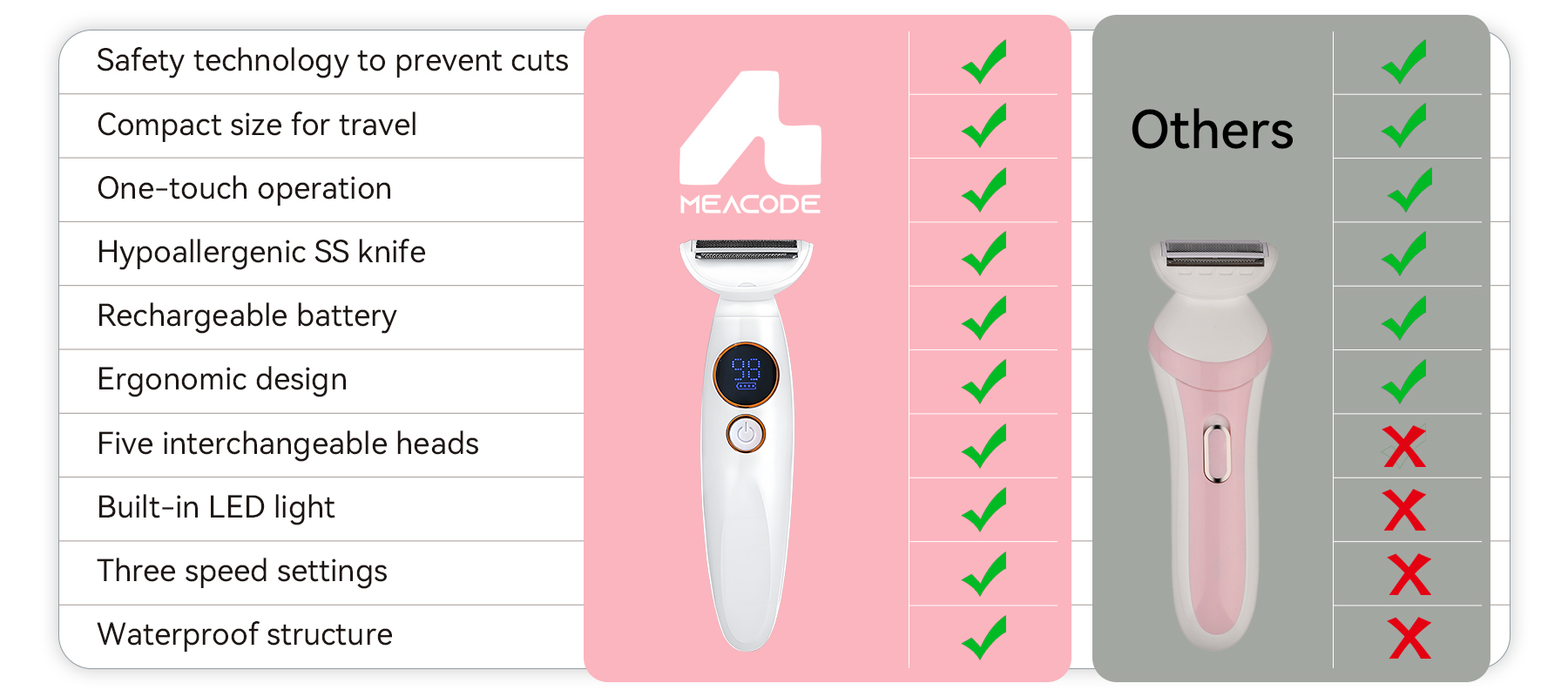 A traditional razor might feel slightly closer initially because it cuts below the skin, but that’s what causes ingrowns. Meacode cuts at skin level, which is 95% as close but without the painful aftermath. Most users find any minor difference in initial smoothness is well worth the elimination of razor burn and bumps.