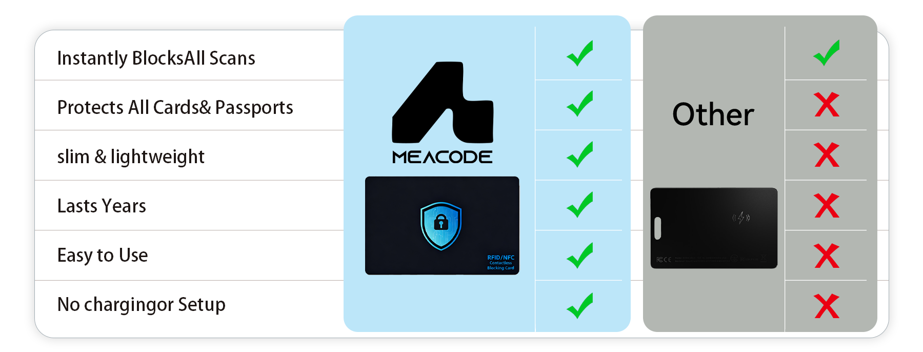 Meacode NFC/RFID Blocking Cards – Safeguard Every Transaction, Protect Every Moment.