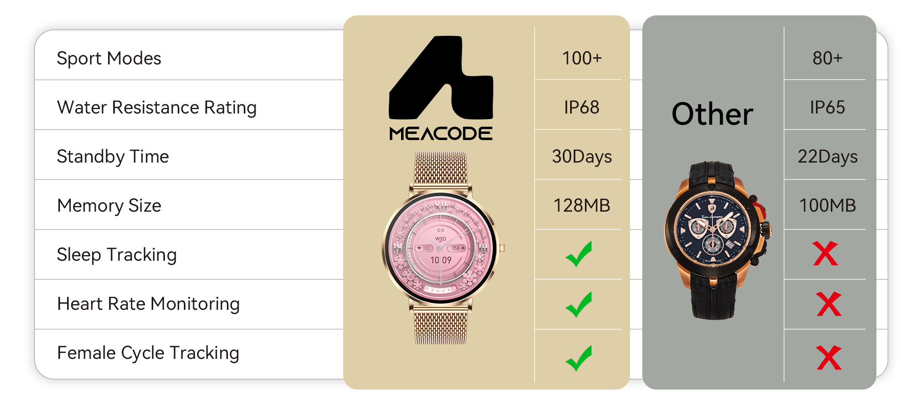 The Meacode Smart Watch was her answer. It is an elegant companion with an ultra-slim design and comprehensive health monitoring. The product was built so she would never have to compromise again.