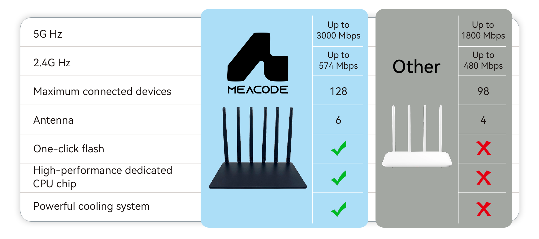 The result is the Meacode WiFi Router, built with a high-performance chip and powerful WiFi 6 technology to ensure you get a fast and stable network for every device, every time. This is Meacode’s core mission: that when it matters most, your network will never let you down.